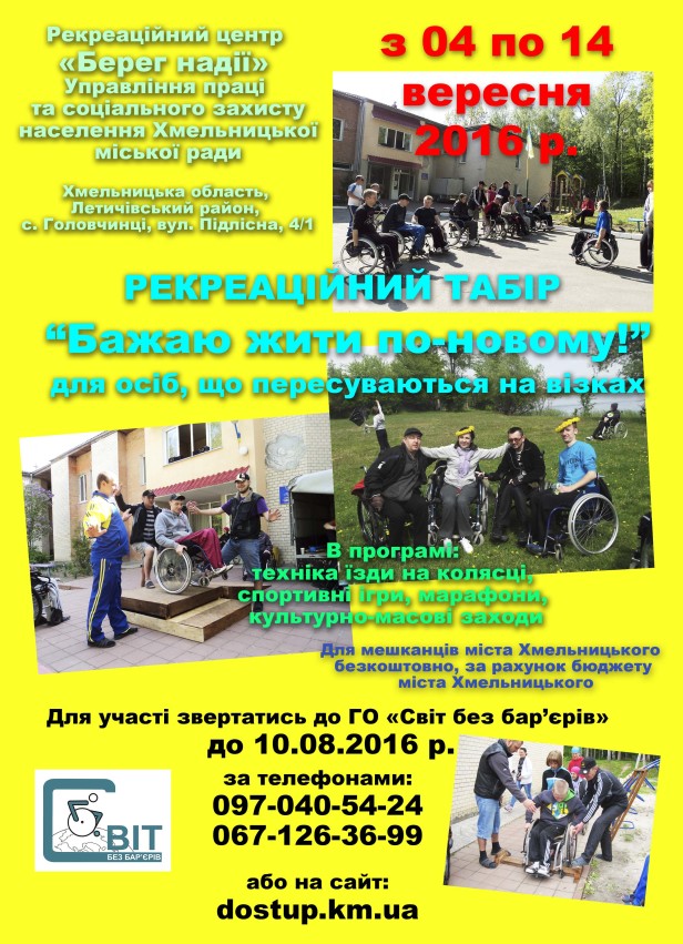 Оголошується набір до рекреаційного табору для осіб, що мають вади опорно-рухового апарату та пересуваються на візках, який проводиться на базі Рекреаційного центру “Берег надії” Управління праці та соціального захисту населення Хмельницької міської ради.